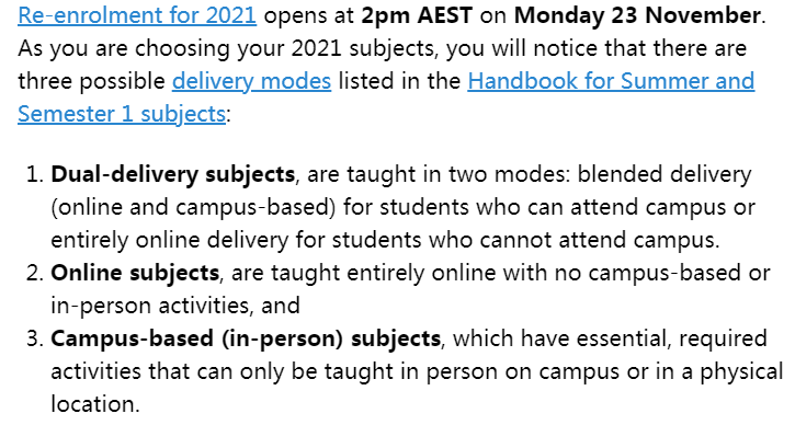 1. Hello, thanks a lot for your comment. The method of delivery depends on the major. You can check the 2021 handbook for more detail.Anyway,I suppose online courses will dominate even if it is dual.