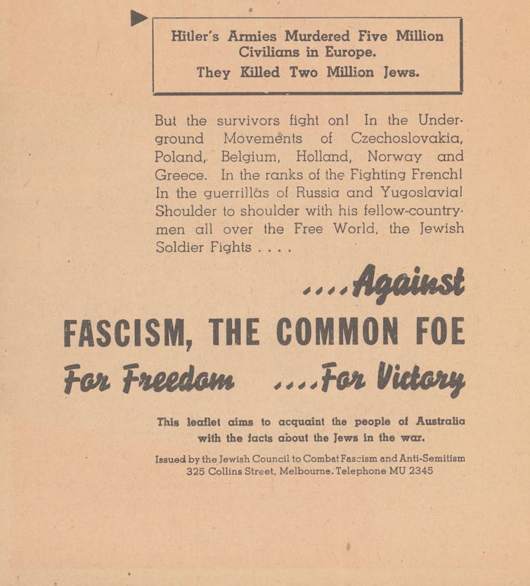 Shall we ignore such ridiculous and poisonous material? Some people in the community because of their sheltered lives in Australia have never really felt or understood the impact of Nazism on the Jewish people. They are advocates of silence. Their counterparts in Hitler’s Germany only learned the folly of their inactivity on the threshold of the gas chamber […] The spreading of fascist and anti-Semitic doctrines threatens us not only as Jews but strikes at the very foundations of our democracy.
